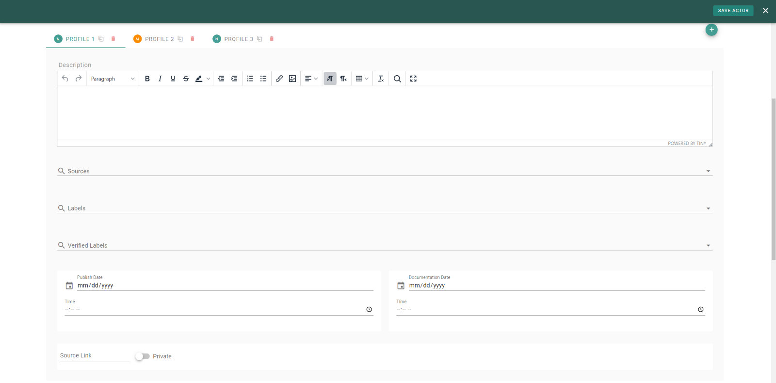 Bayanat's precisely crafted data structure is tailored for documenting, analyzing, and investigating violations of human rights and international humanitarian law. Despite its robust framework—organized into three core sections: Actors, Bulletins, and Incidents—managing information about the same Actors from numerous, diverse sources presented significant challenges. These scattered profiles often made it difficult to see connections or the full picture of a person's or an entity's involvement, highlighting the pressing need for a solution like the new Actor Profile.