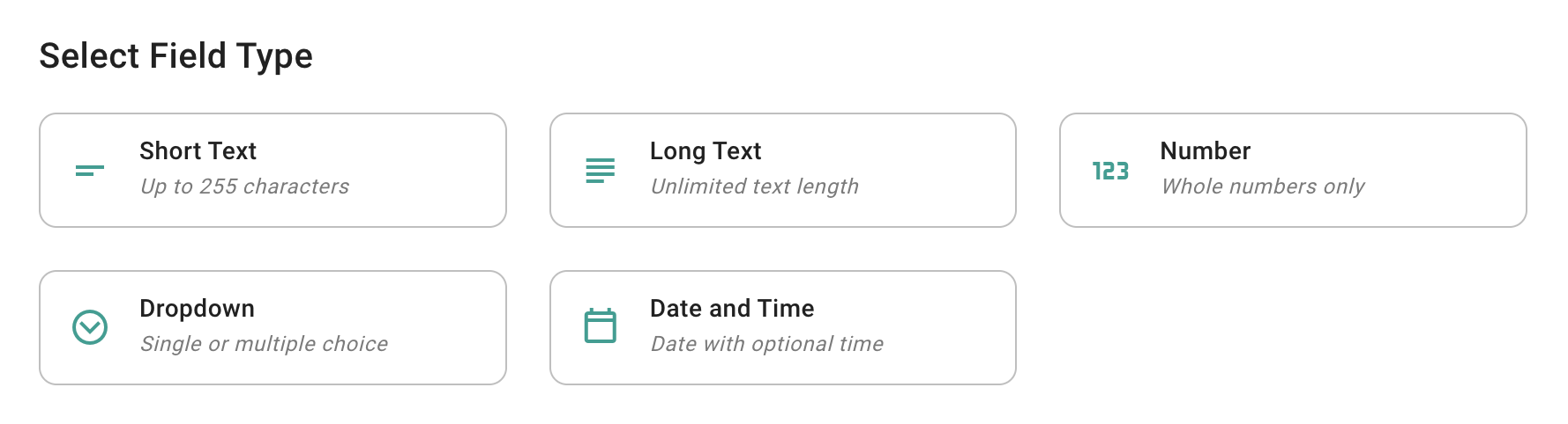 Additionally, The Form Builder supports five field types that cover the most common data collection needs: